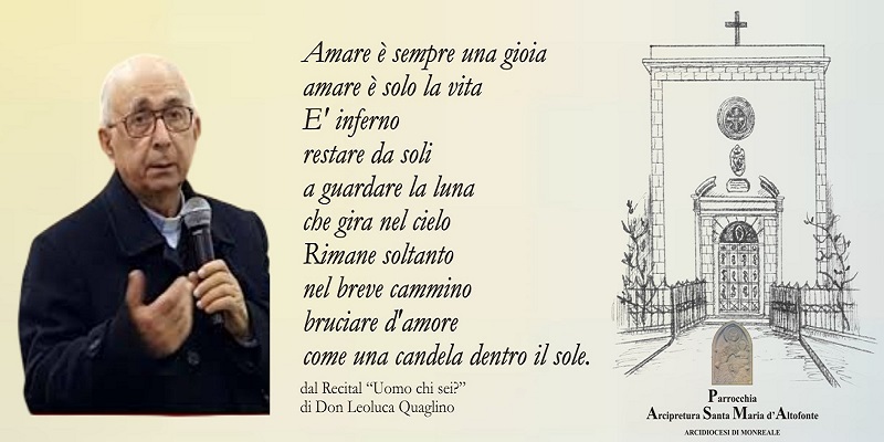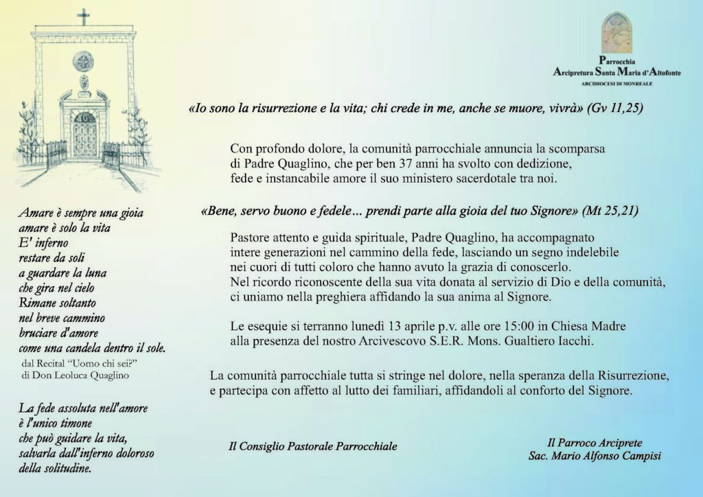 Attività - Eventi Avviso Don Leoluca Quaglino è tornato alla Casa del Padre di Paolo Cannova|Pubblicato 11 Aprile 2026 Condividi: Condividi su Facebook (Si apre in una nuova finestra) Facebook Condividi su X (Si apre in una nuova finestra) X Condividi su WhatsApp (Si apre in una nuova finestra) WhatsApp Invia un link a un amico via e-mail (Si apre in una nuova finestra) E-mail Stampa (Si apre in una nuova finestra) Stampa