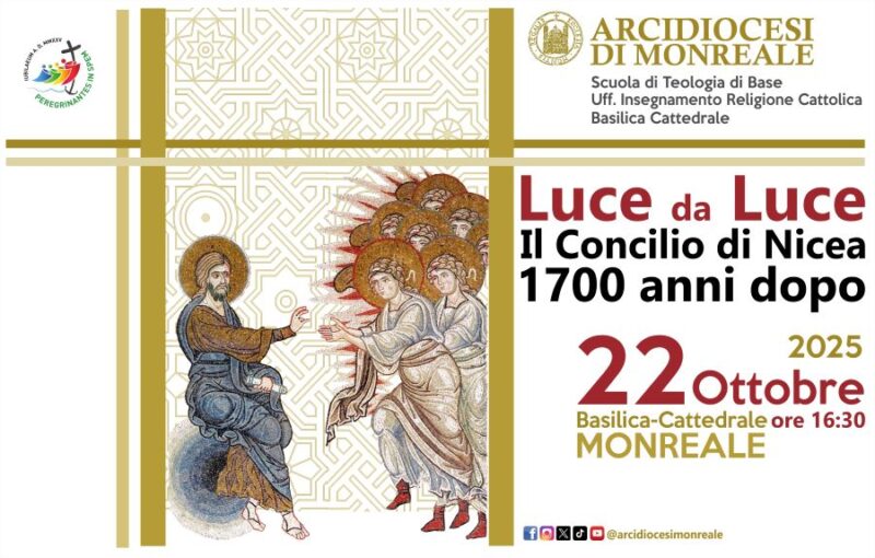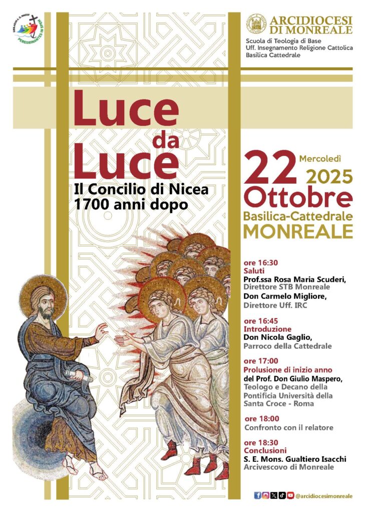 Mercoledì 22 ottobre con inizio alle 16.30, presso la Basilica Cattedrale di Monreale si terrà la prolusione di inizio anno accademico della Scuola di Teologia di Base, davvero un evento eccezionale per la presenza del relatore. Infatti, a tenere la prolusione sul tema: “Luce da Luce” il Concilio di Nicea 1700 anni dopo, sarà il Prof. Don Giulio Maspero, Teologo, Decano dell’Università Pontificia della Santa Croce in Roma.