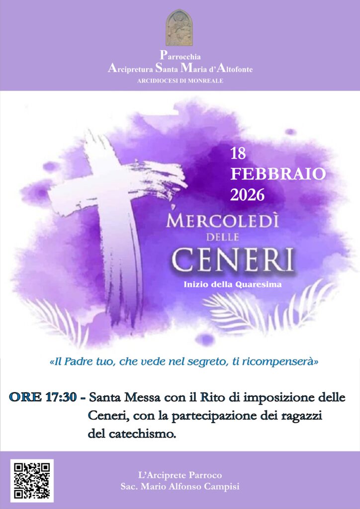 Attività - Eventi Avviso Mercoledì delle Ceneri – Inizio della Quaresima 2026 di Paolo Cannova|Pubblicato 12 Febbraio 2026 Condividi: Condividi su Facebook (Si apre in una nuova finestra) Facebook Condividi su X (Si apre in una nuova finestra) X Condividi su WhatsApp (Si apre in una nuova finestra) WhatsApp Invia un link a un amico via e-mail (Si apre in una nuova finestra) E-mail Stampa (Si apre in una nuova finestra) Stampa